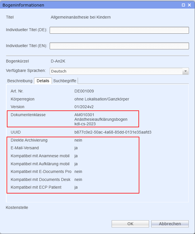 Die hinterlegten KDL-Codes können in den Bogeninformationen des aufgerufenen Dokuments im Reiter Details eingesehen werden (siehe Bogeninformationen anzeigen):