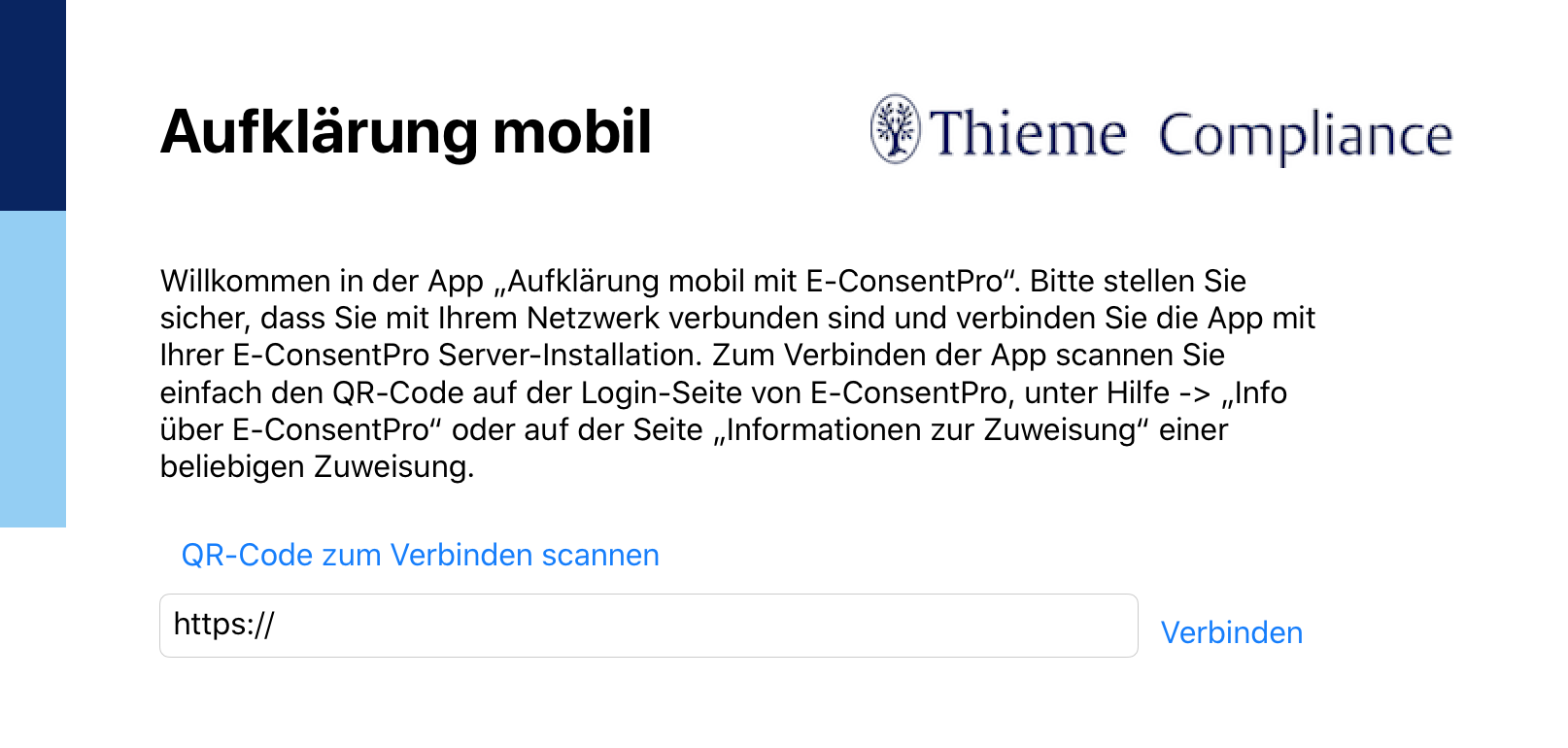 Um die Apps "Anamnese mobil", "Aufklärung mobil" und E-DocumentPro mit dem E-ConsentPro-Server zu verbinden, können Sie einen QR-Code scannen oder die URL-Adresse manuell eingeben.