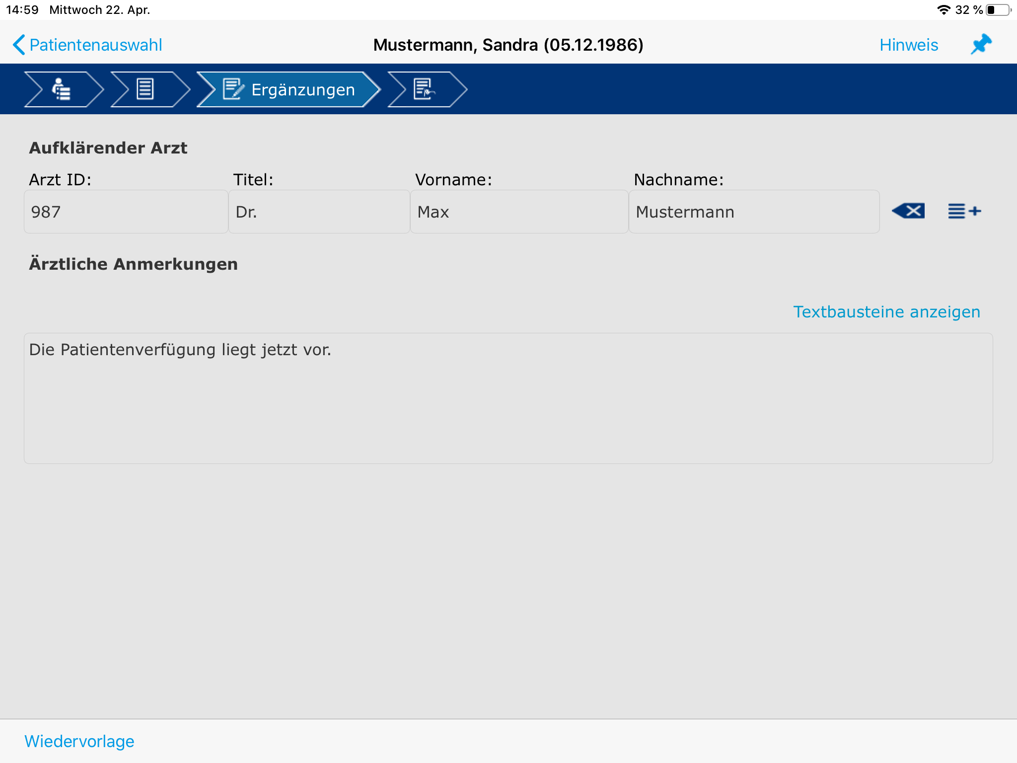 Über die Arbeitsliste Patient in E-ConsentPro können Sie ebenfalls Ergänzungen hinzufügen und diese anschließend in der App Aufklärung mobil bearbeiten.