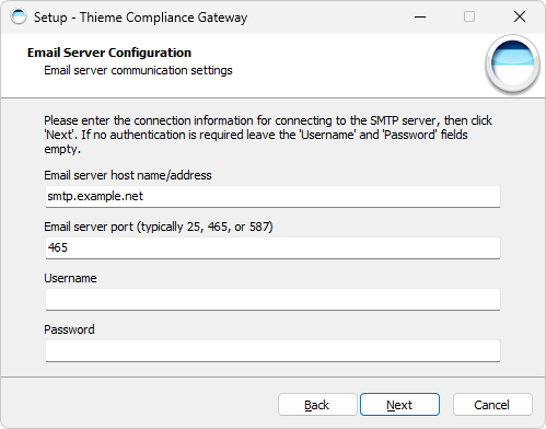 Wenn Sie von einer Version vor 9.0.0 aktualisieren, werden in diesem Dialog nicht die bisherigen Konfigurationseinstellungen angezeigt, sondern Beispielwerte. Tragen Sie in diesem Fall die Einstellungen neu ein. Entnehmen Sie die Werte bei Bedarf - mit Ausnahme des Passworts - der Datei config-application.yml in Ihrem Gateway-Verzeichnis, Abschnitt email. Falls Sie das unverschlüsselte Passwort nicht zur Verfügung haben, lassen Sie das Feld leer.