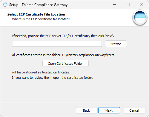 Falls die Verbindung zum E-ConsentPro Server über HTTPS (nicht HTTP) stattfindet und der E-ConsentPro Server ein Self Signed Certificate verwendet, benötigt das Thieme Compliance Gateway während des Updates das HTTPS-Zertifikat (TLS/SSL-Zertifikat) des E-ConsentPro Servers erneut.