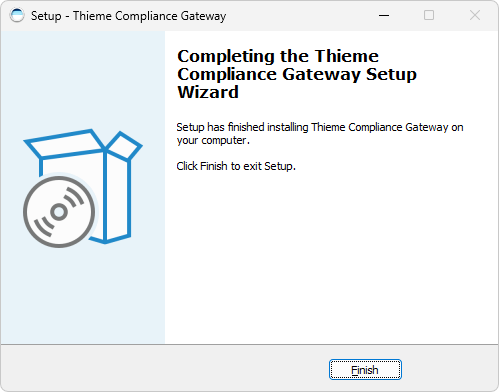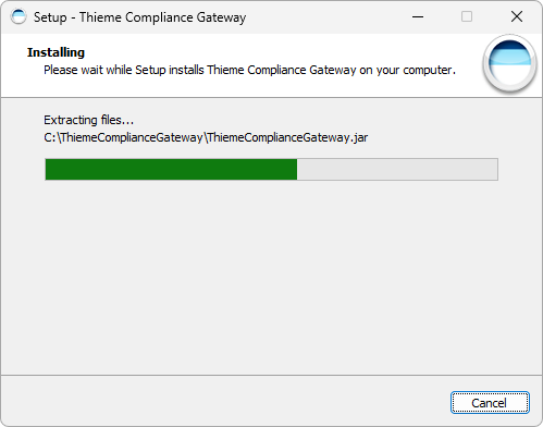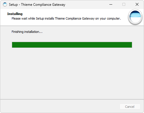 Wenn die Fortschrittsanzeige den Wert 100% erreicht hat, sind alle Dateien im Zielverzeichnis installiert. Dann werden die Dienste des Thieme Compliance Gateways gestartet. Deswegen kann es unter Umständen wenige Minuten dauern, bis der abschließende Informationsdialog angezeigt wird.