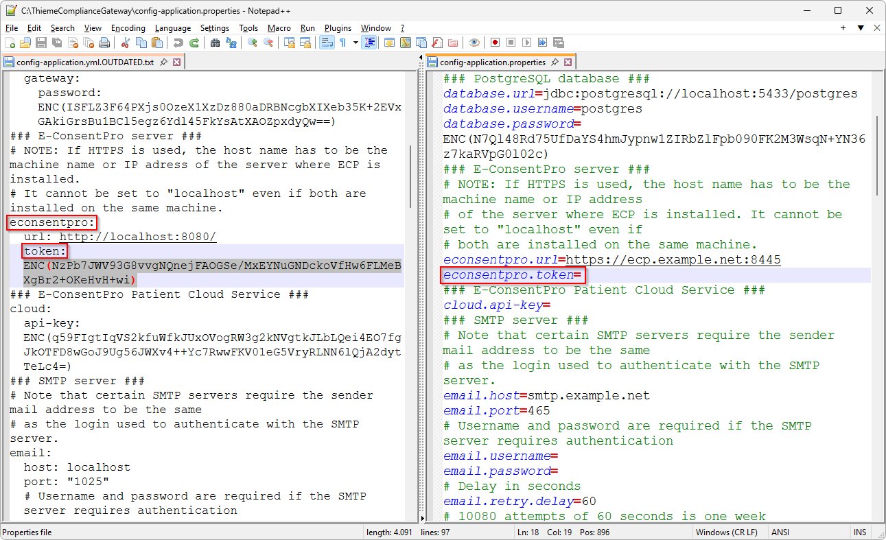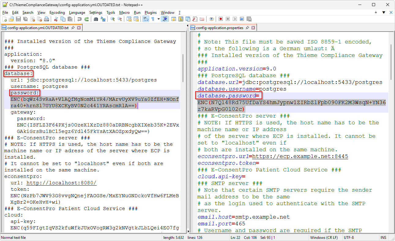 Übertragen Sie in die Datei config-application.properties insbesondere die Einstellung database.password (hier müssen Sie den bisherigen Wert ersetzen) sowie alle Einstellungen für Token, Passwörter und API Keys, die Sie bei der Update-Installation leer gelassen haben (und die in der Konfigurationsdatei auch leer sind). Token, Passwörter und API Keys sind in der alten Konfigurationsdatei config-application.yml.OUTDATED.txt verschlüsselt gespeichert in der Form ENC(yxz...abc). Übertragen Sie sie genauso (einschließlich ENC und Klammern) in die neue Konfigurationsdatei. Checkliste: