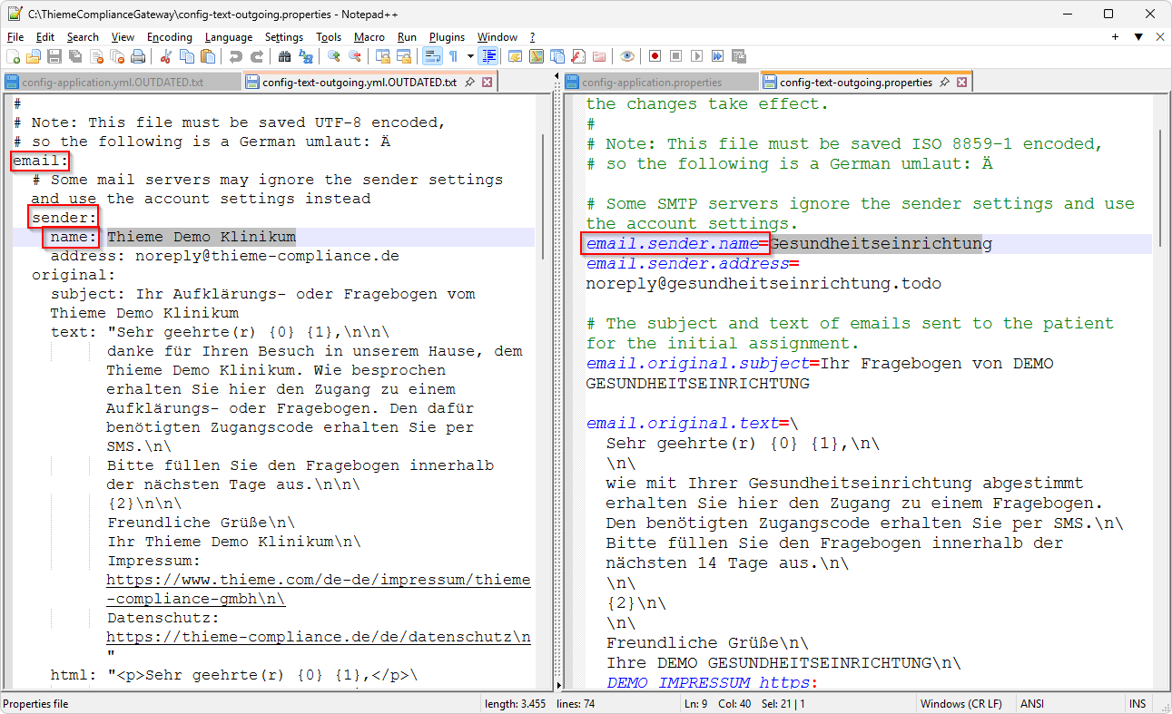 Wenn Sie von einer Version vor 9.0.0 aktualisieren, dann wurden Ihre bisherigen Konfigurationsdateien config-application.yml und config-text-outgoing.yml automatisch umbenannt zu config-application.yml.OUTDATED.txt und config-text-outgoing.yml.OUTDATED.txt. Vergleichen Sie in dem Fall die Einträge in den *.OUTDATED.txt Dateien mit den Einträgen in den aktuellen Konfigurationsdateien config-application.properties und config-text-outgoing.properties und passen Sie die aktuellen Konfigurationsdateien entsprechend an: