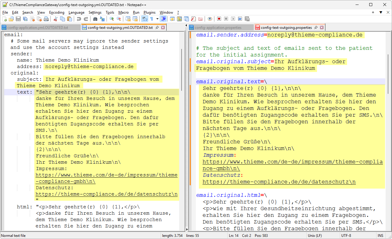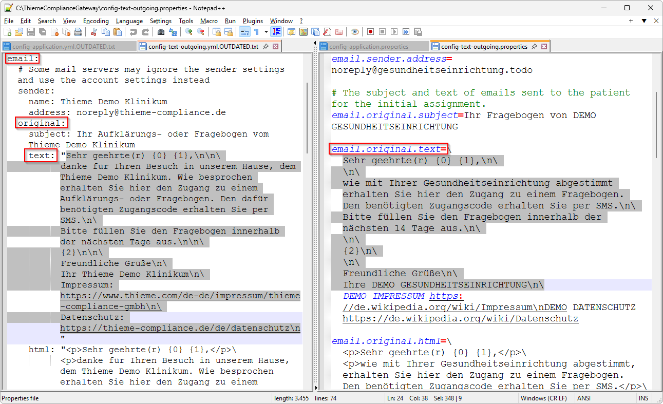 Übertragen Sie in die Datei config-text-outgoing.properties alle Einstellungen für E-Mail- und SMS-Texte aus der alten Konfigurationsdatei config-text-outgoing.yml.OUTDATED.txt. Beachten Sie dabei, dass in der neuen Konfigurationsdatei die Texte ohne umschließende Anführungszeichen konfiguriert werden.